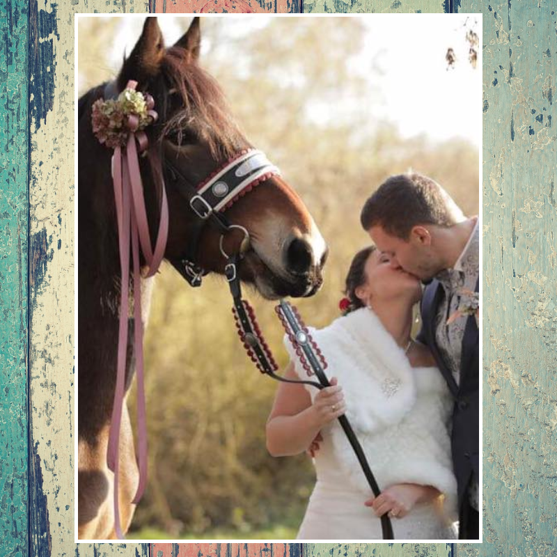 Mit zwei Ohrenrosen und mit einem Pferdekopf Behang verziert.