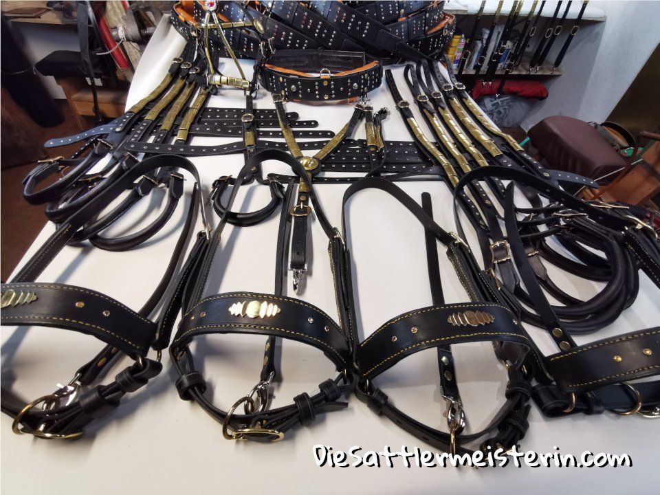 Im Gegensatz kann ich mich auf die vielen Kundenaufträge der Sattlerei konzentrieren, wie zum Beispiel jetzt, wo gerade 10 Pferdegarnituren für den Zirkus Berlin, bestehend aus Prunkzäumen, Prunkvorderzeuge, Rollierzügel (Ausbindezügel), Prunklongierbauchgurte, Prunkschweifriemen mit Seitenverzierung, gemacht für 4 Friesen, 1 Andalusier, 4 Araber und einen Zwergpony in Arbeit sind.